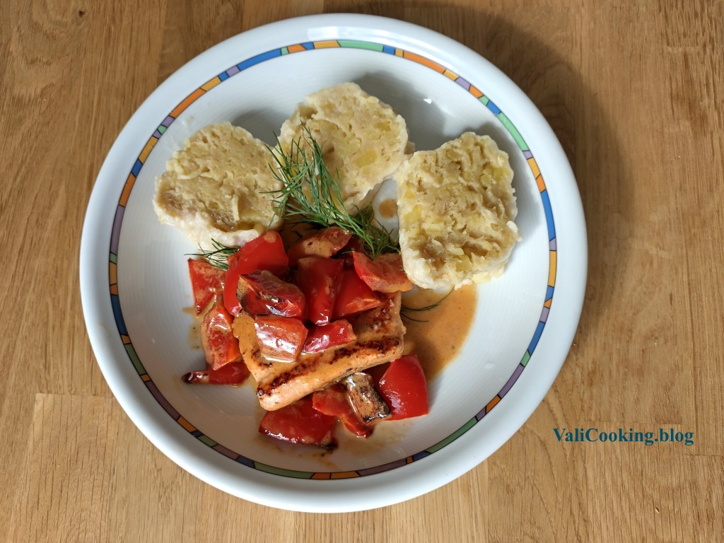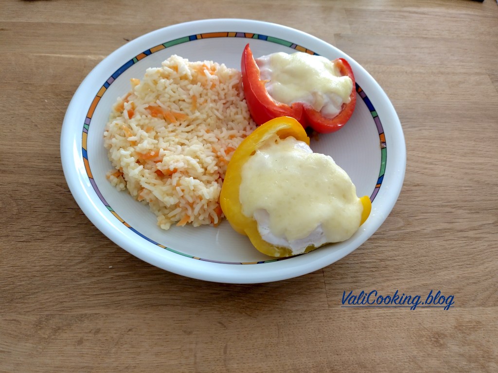 4 Transfer the stuffed peppers to the large pot with the tops from bell peppers. Add tomato passata and water to cover the bell peppers.