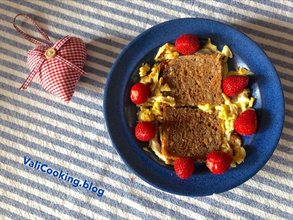 Ingredients (2 servings): – 2 eggs – 4 wholegrain bread slices – 2 tbsp milk – 2 tbsp cane sugar – 1 tbsp butter Method: 1 Whisk eggs with milk and sugar 2 Melt butter on the frying pan and toast bread slices on one side 3 Turn bread slices and pour in eggs mixture, continuously tossing until ready (1-2 minutes) 4 Serve with fresh berries!