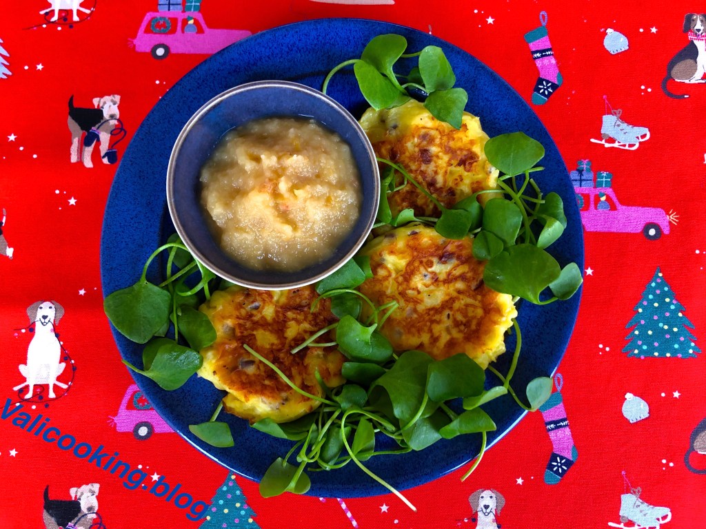 Method: 1 Apple compote 1.1 Wash and de-seed apples 1.2 Chop the apples 1.3 Cook the apples with lemon juice at medium heat until tender in the pan for 4-6 minutes 1.4 Mash the apples until smooth with an immersive blender 2 Potato pancakes 2.1 Peel the potatoes and boil them until ready 2.2 Batter: mix well mashed potatoes & chopped onion & salt & pepper & eggs & flour 2.3 Pre-heat the non-sticking skillet with one olive oil 2.4 Fry 1 tbsp batter for each pancake for 2-3 minutes each side 2.5 Put the ready pancake on the paper towel to get rid off extra oil 3 Serve potato pancakes with a warm apple compote and fresh miner’s lettuce !