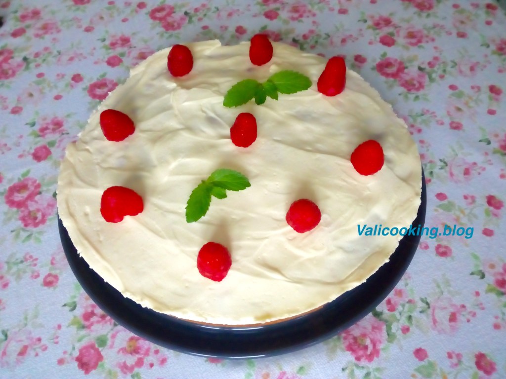Cream &decorating ingredients – 125g fresh raspberry – a few mint leaves Directions: 1 Whisk butter with sugar and Vanilla sugar 2 Add eggs+sour cream to butter & sugar and whisk again 3 Mix in flour to butter+eggs+sour cream+sugar+baking soda&vinegar 4 Preheat the oven to 190C 5 Pour the batter into the buttered baking form and add fresh raspberries 🙂 6 Bake 20-25 minutes at 190C (depends on your oven, check with a wooden stick!!) 7 While the cake is being baked, make the cream: slightly whisk sour cream with sugar, then put the cream in the fridge for a while 🙂 8 Let the cake cool down, then pour the cream over the cake and put the baking form in the fridge overnight (best of all, for 14 hours) 9 Serve with fresh raspberries and mint 🙂
