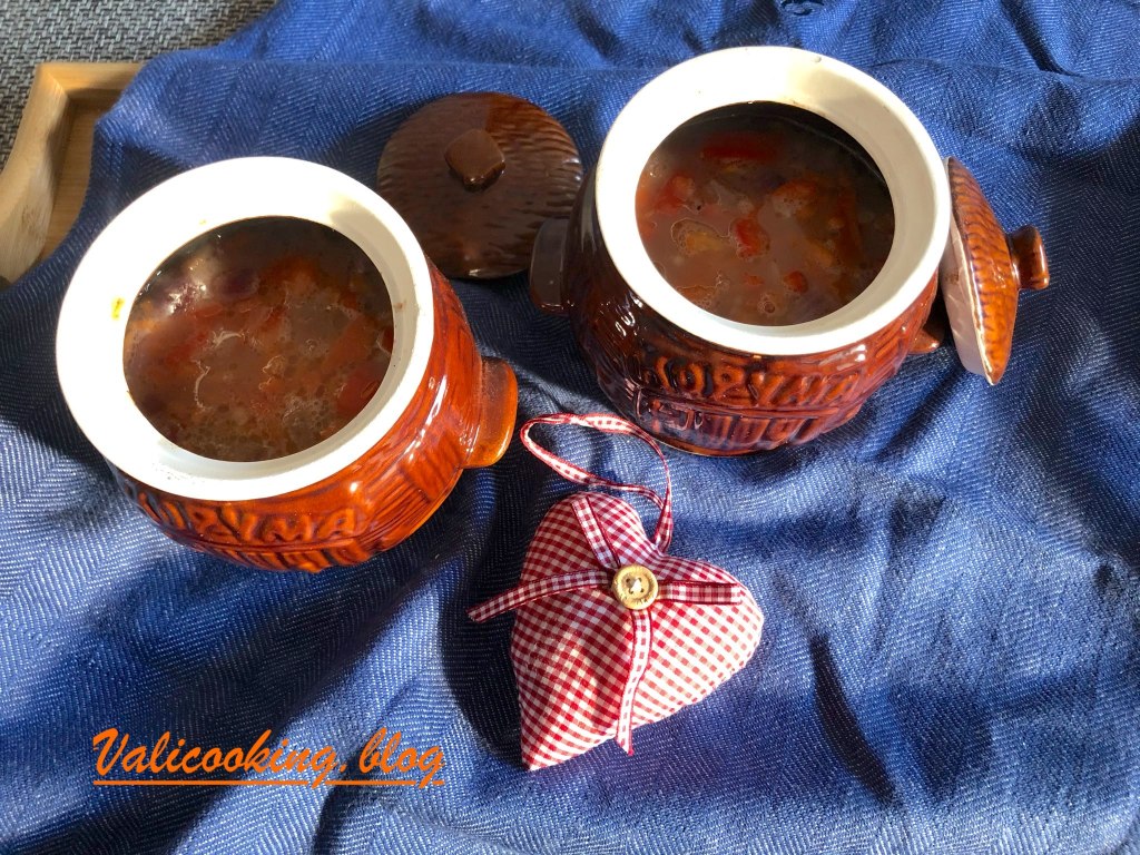 Ingredients (6 pots): – 400g minced beef – 3 red bell peppers – 5-6 carrots – one large red onion – 1 glass (250ml) pearl barley – 2 tsp salt – 5-6tbsp tomato puree (pure tomatoes, not salted) – 300-350ml water in each pot